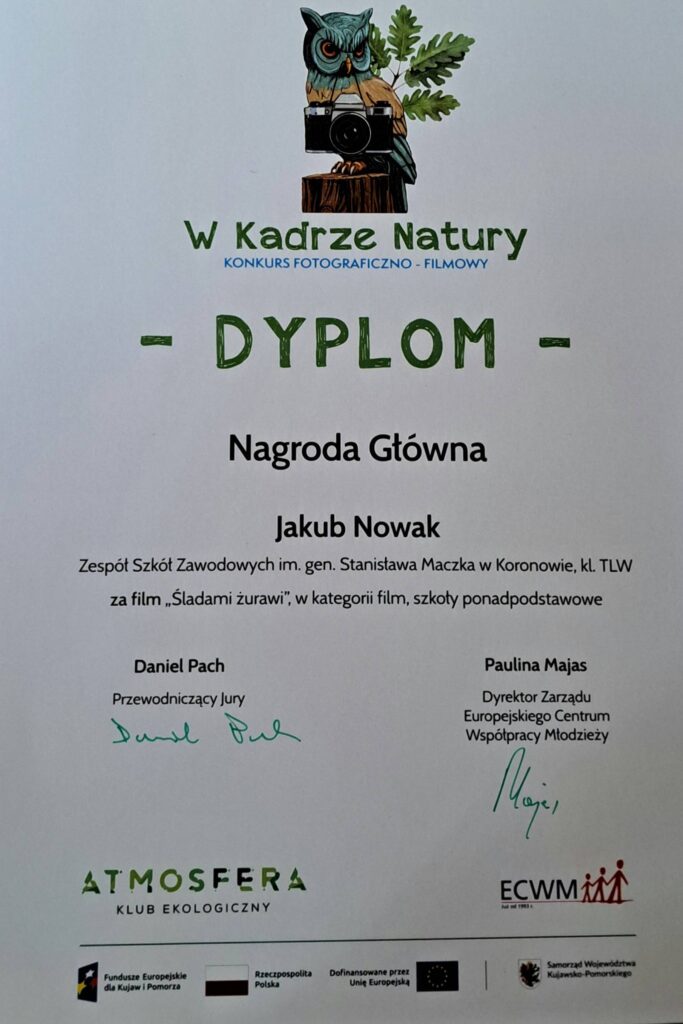 Kolejny sukces Jakuba Nowaka. Tym razem w konkursie fotograficzno-filmowym „W Kadrze Natury” zdobył główną nagrodę w kategorii filmowej szkół. ponadpodstawowych.