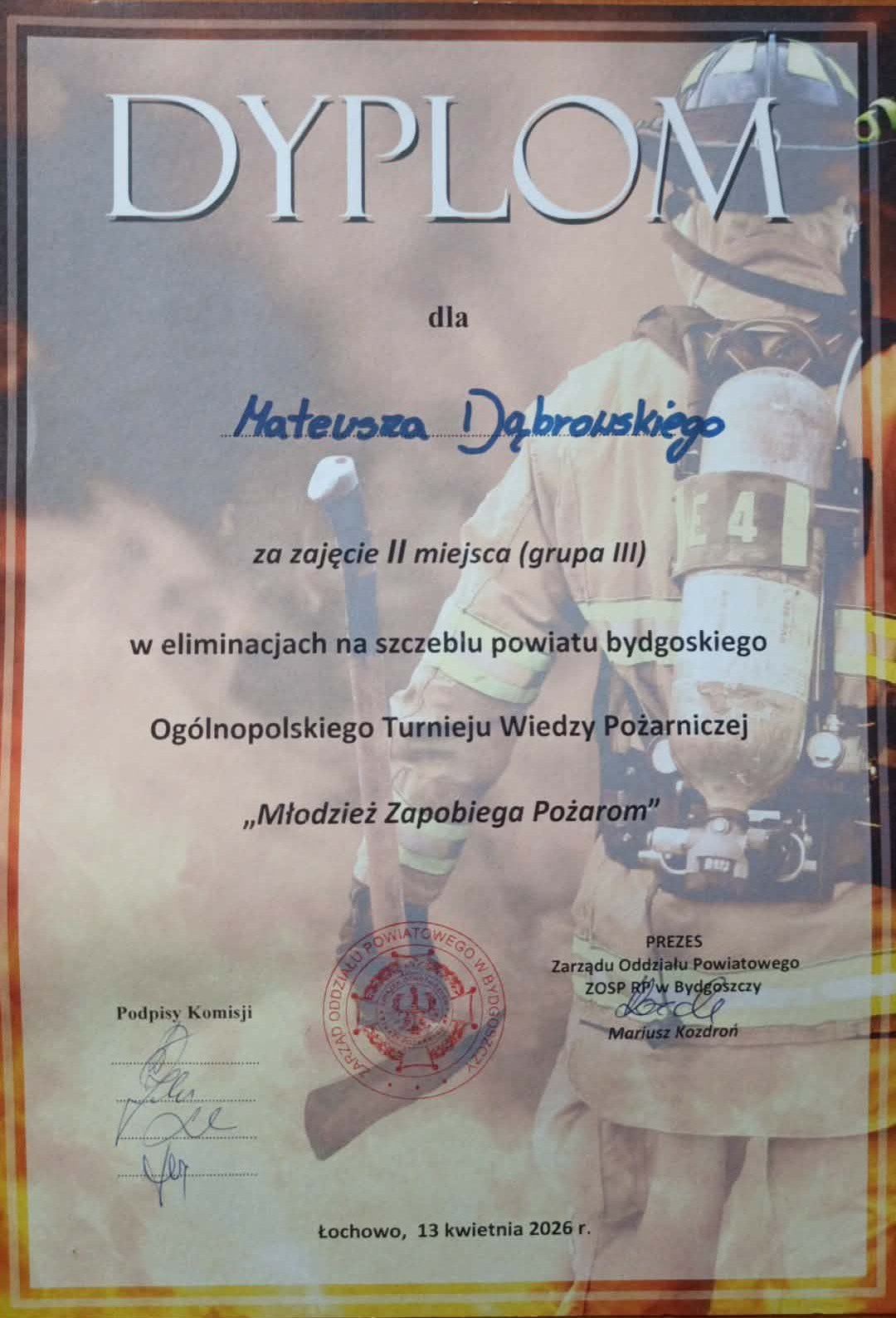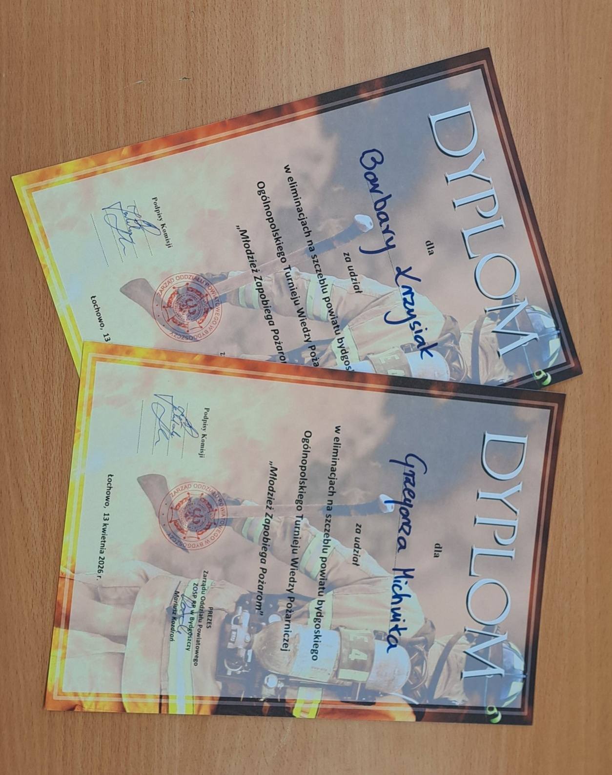 Wczoraj w szkole podstawowej w Łochowie odbył się etap powiatowy Ogólnopolskiego Turnieju Wiedzy Pożarniczej „MŁODZIEŻ ZAPOBIEGA POŻAROM”. Barbara Krzysiak z klasy 1T oraz Grzegorz Michnik z klasy 1TLW reprezentowali gminę Koronowo, a Mateusz Dąbrowski z klasy 4TEM – gminę Dobrcz.