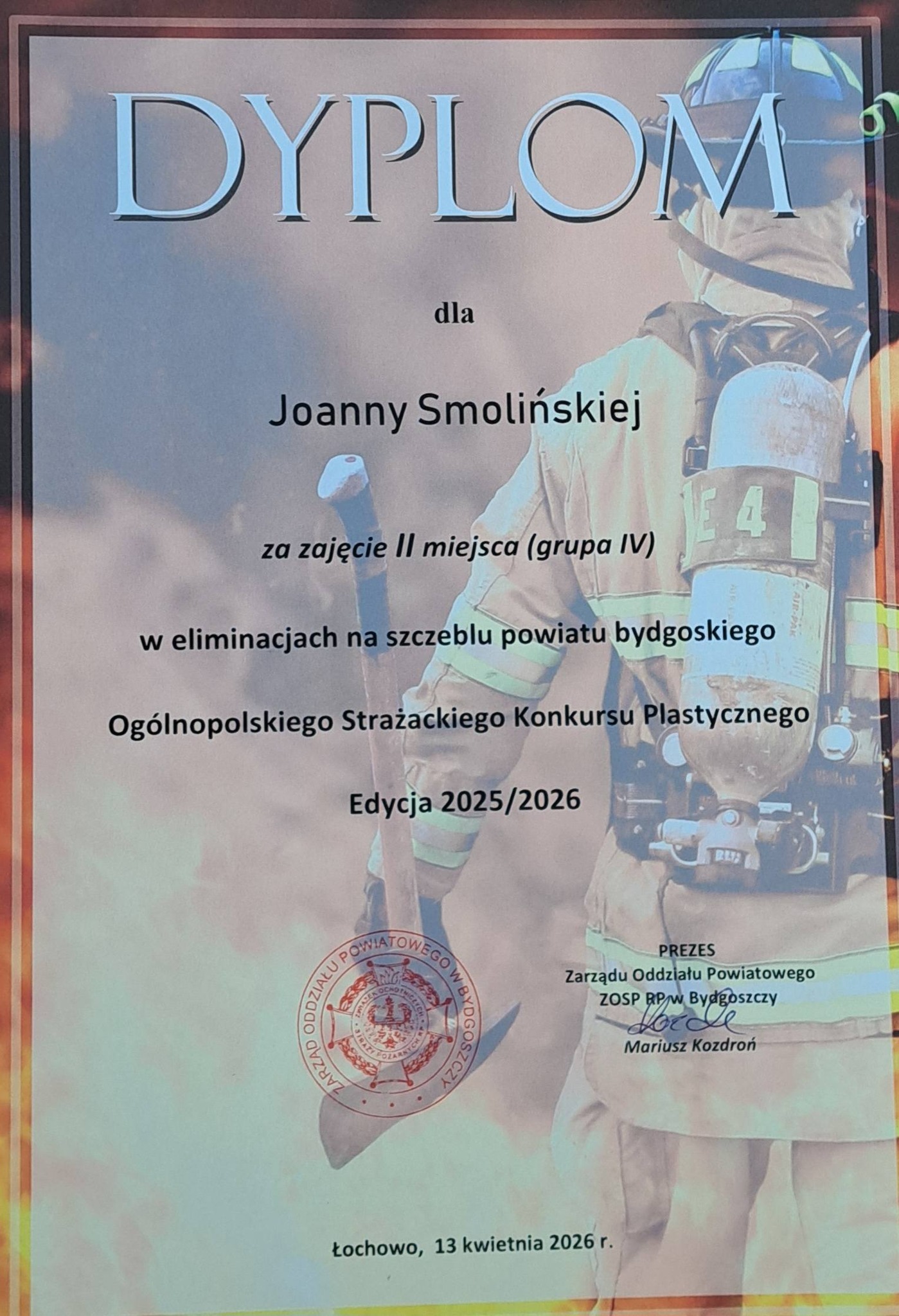 zajęła 🥈miejsce w etapie powiatowym Ogólnopolskiego Strażackiego Konkursu Plastycznego.
